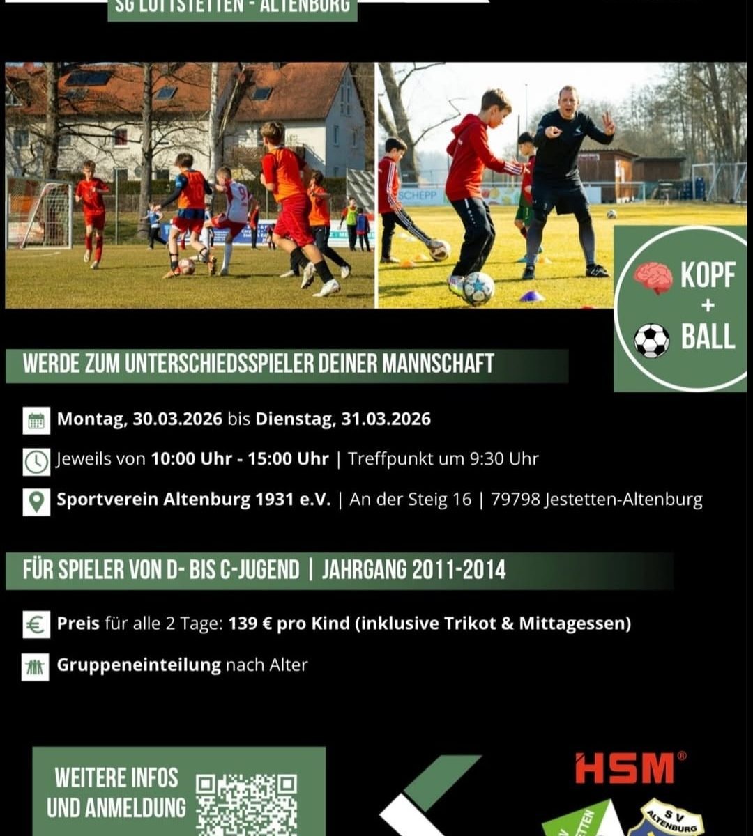 In den Osterferien findet bei der SG Lottstetten-Altenburg das Soccerkinetics Ostercamp statt. Am Montag, 30. März 2026, und Dienstag, 31. März 2026 trainieren fußballbegeisterte Kinder jeweils von 10:00 bis 15:00 Uhr auf dem Gelände des Sportverein Altenburg 1931 e.V. (An der Steig 16, 79798 Jestetten-Altenburg). Treffpunkt für alle Teilnehmer ist jeweils um 9:30 Uhr.